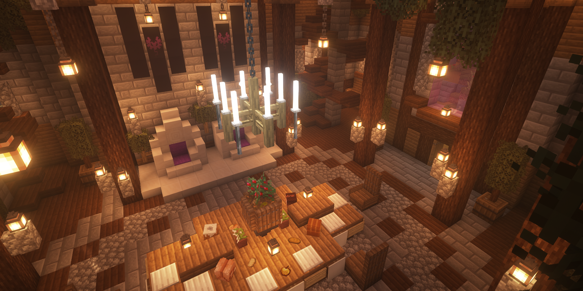 Inside, Windbrooke Castle transforms from fortress to home. The grand hall glows with soft lamplight, where polished oak tables and cozy hearths invite weary travelers to rest. Lanterns sway gently from high beams, illuminating stone walls adorned with banners and hanging ivy. A great chandelier crowns the dining space, casting golden reflections across the tables below. Every room within tells its own story—from the library alcoves to the private chambers tucked behind ornate staircases—each one crafted with care and attention to atmosphere.