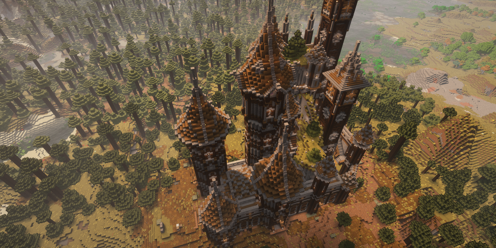 The castle’s towering design tells a story of ambition and balance. Each spire is carefully layered, with roofs cascading like waves of terracotta and timber, reaching toward the clouds. Pathways and balconies connect the towers, offering breathtaking views of the dense forest below. The symmetry of its construction is broken only by the occasional creeping vine or patch of overgrown moss, subtle details that give the build a touch of realism and age.